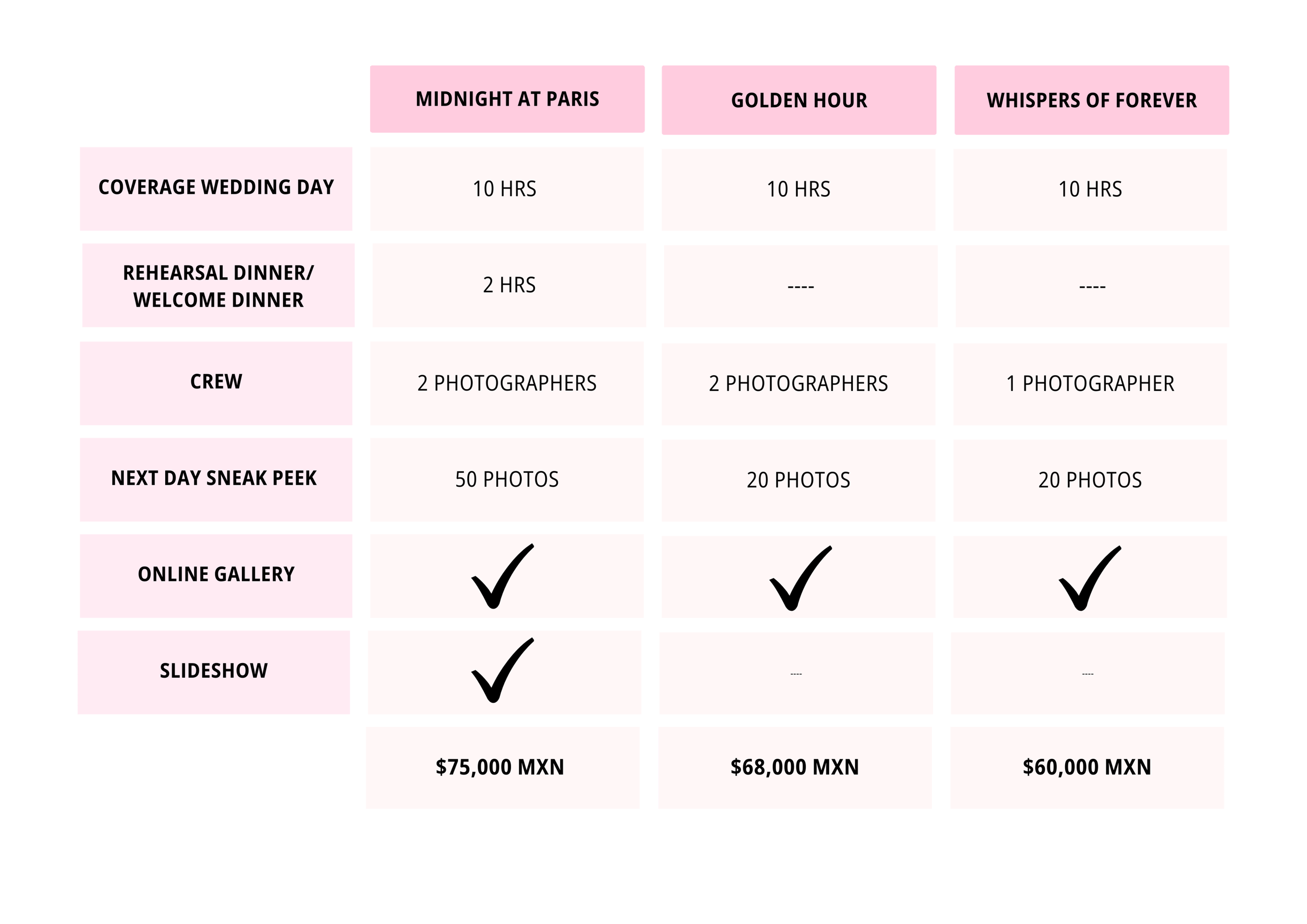 + 2 additional hours for (Engagement Shoot / Welcome Dinner / Rehearsal)